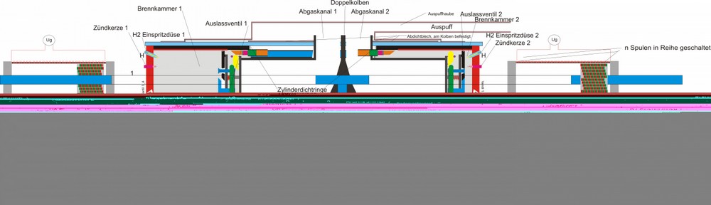 1. Der Motor ist ein Zweitaktmotor, der aber mit normalen Benzin oder Diesel oder, wie hier gezeichnet, mit Wasserstoff betrieben wird.